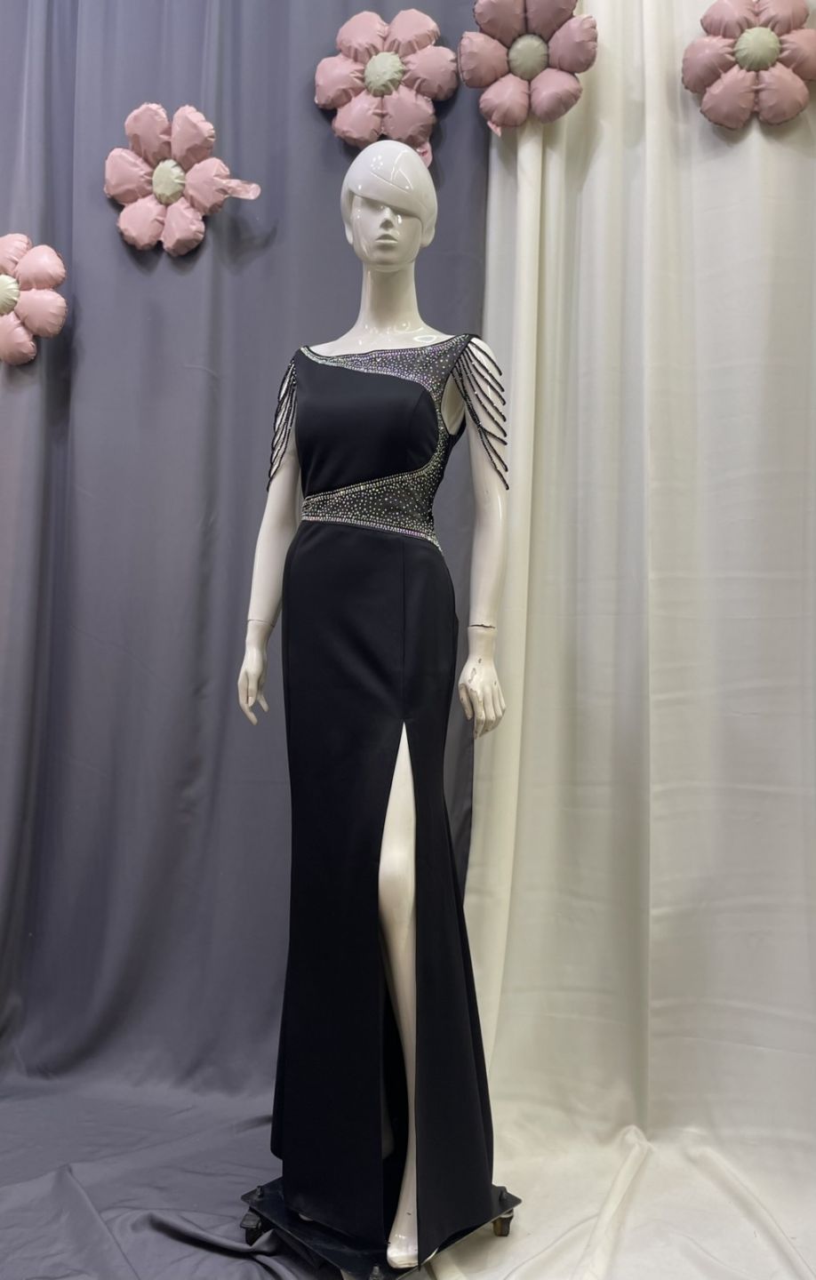 手臂垂珠魚尾開叉長禮服