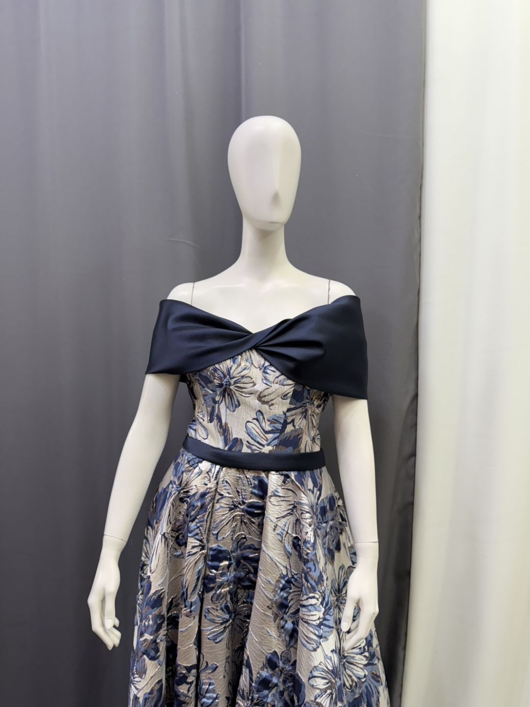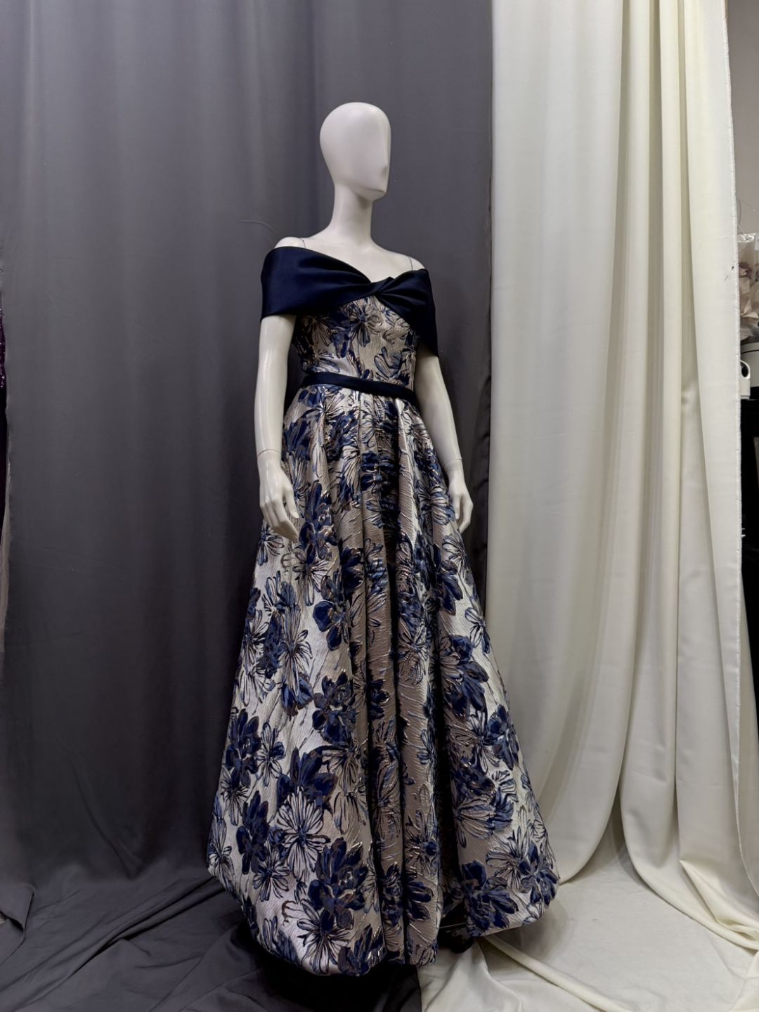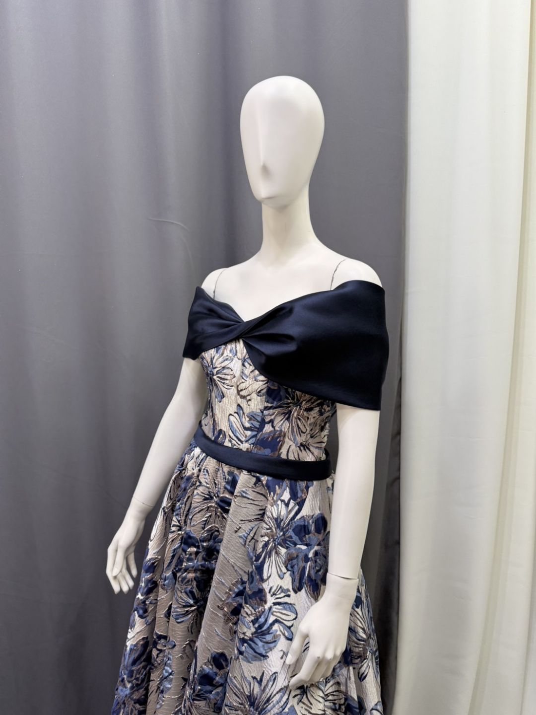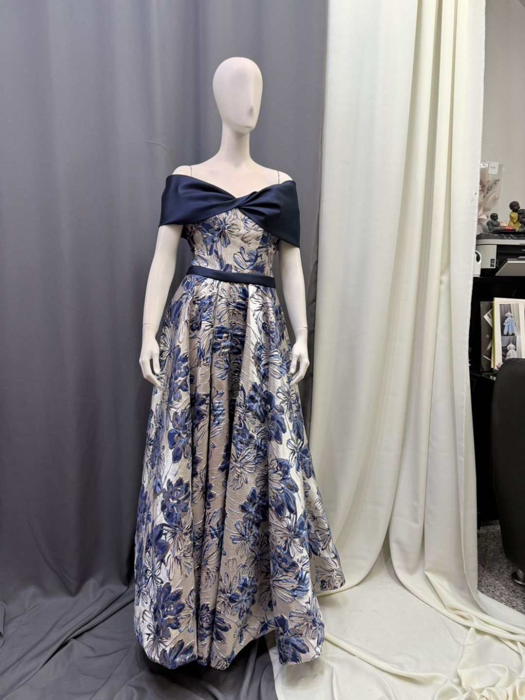 優雅、溫柔,又帶著大氣存在感。立體織紋花朵遍布裙身,像穿上一座藍白花園,披肩領線條修飾肩頸,帶出古典而高級的氣質。大裙擺在行走間自然展開,每一步都典雅、每一回眸都動人。無論是婚宴主桌、拍照、典禮或媽媽服,都是溫柔又不失高貴的完美選擇。