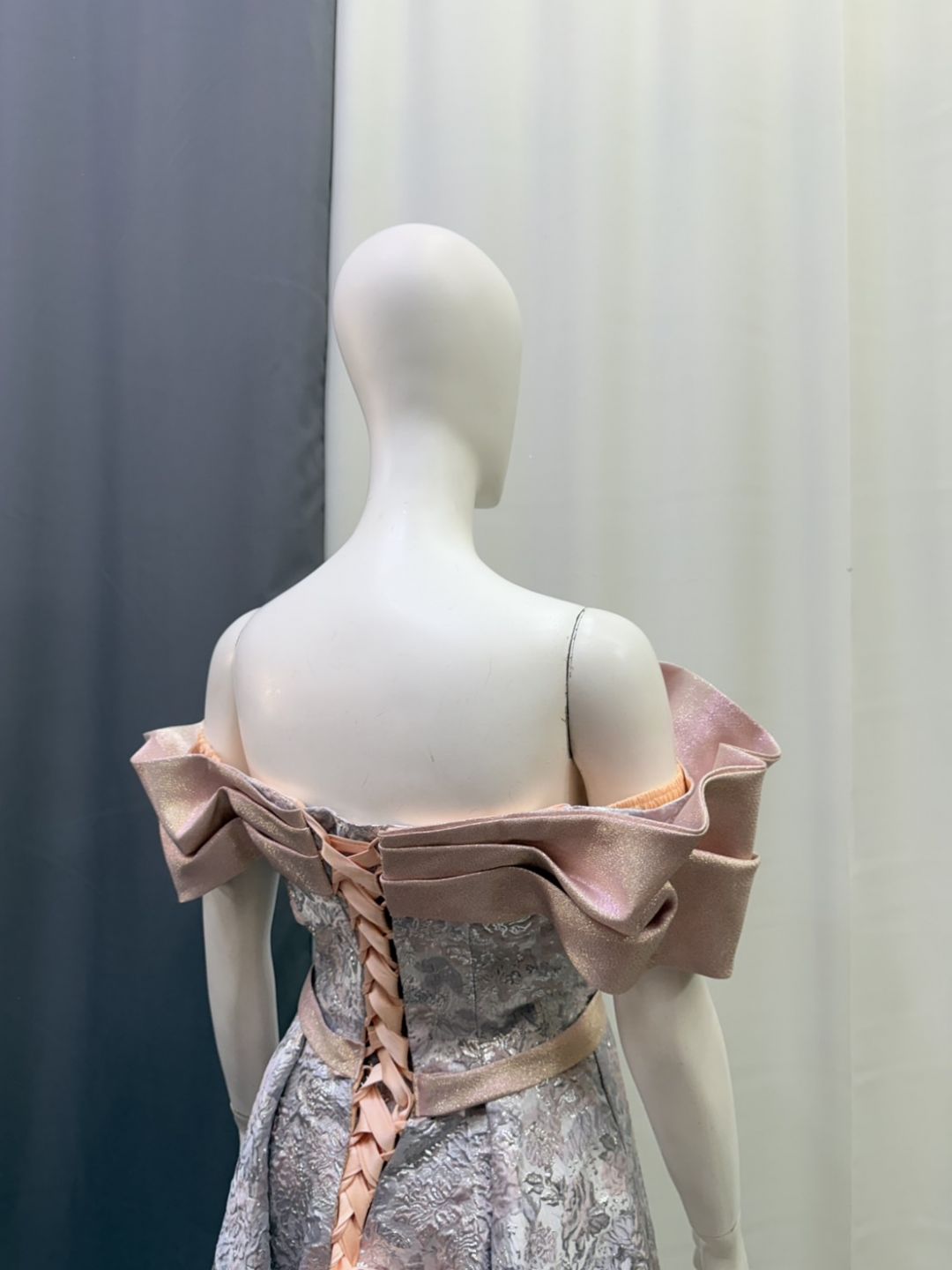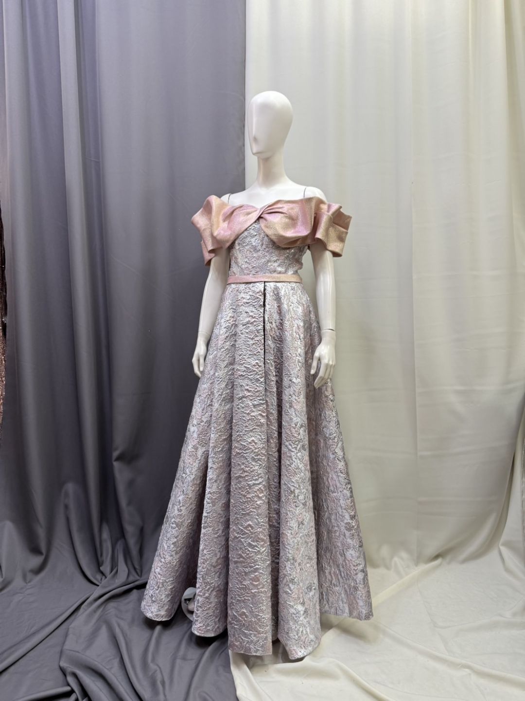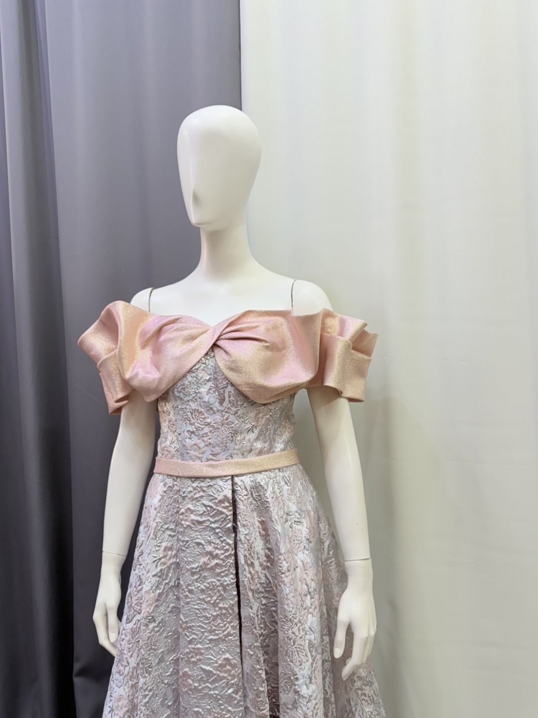 柔粉與淡紫交織的織花面料,如晨曦映照花瓣的光澤。 立體的蝴蝶結肩襬勾勒浪漫輪廓,微閃的布料折射出夢幻光暈,讓氣質更顯溫柔與純粹。 這件小禮服適合婚宴、音樂會、藝術展等場合,散發出不經意的高雅與柔和光彩。