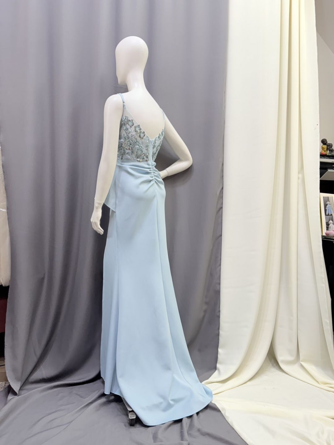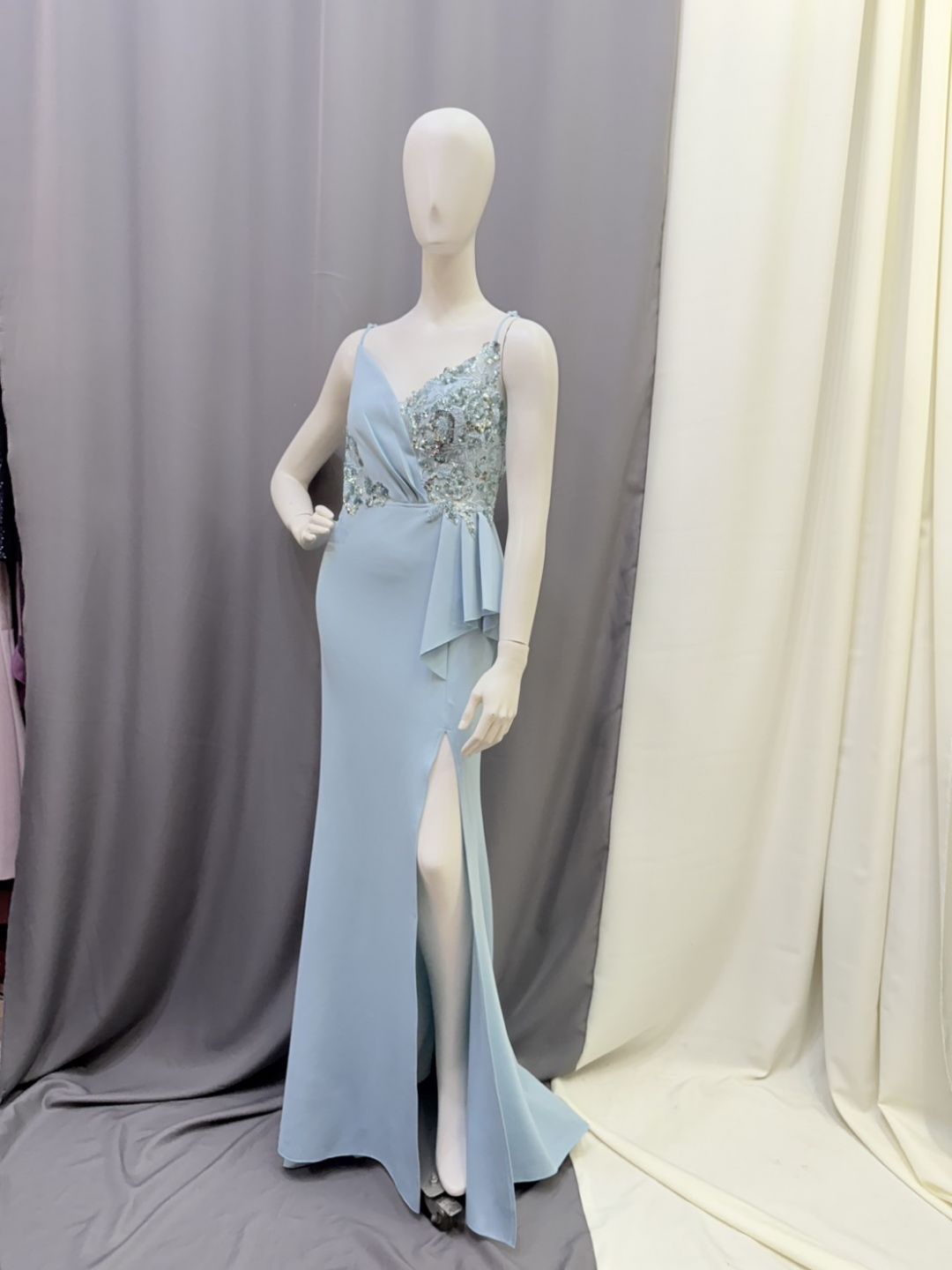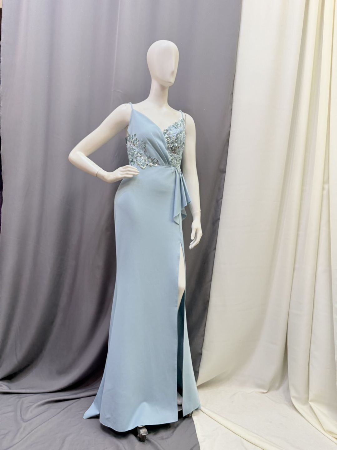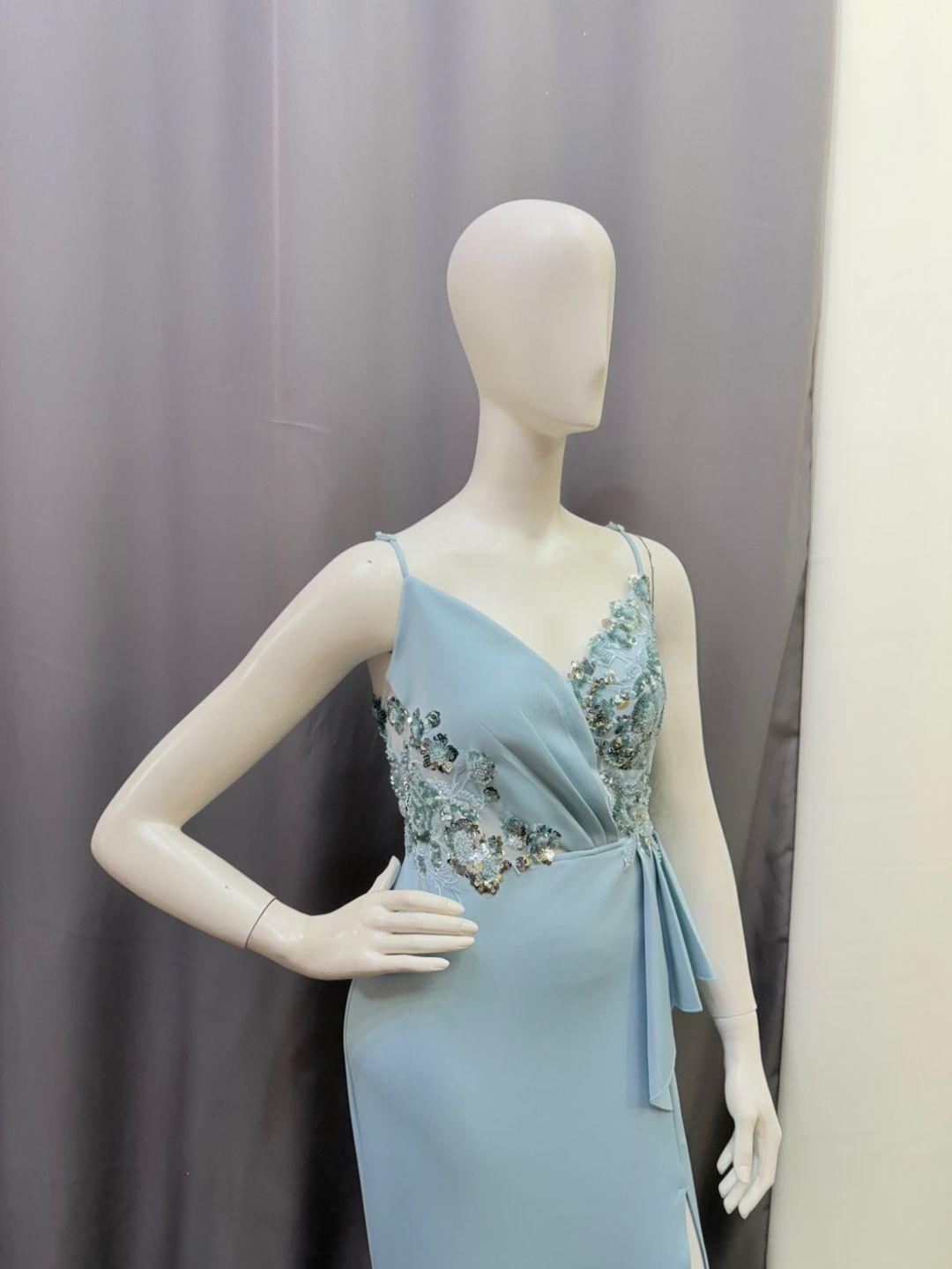清透的冰藍色,像晨光落在湖面的柔亮。上身以精緻亮片花飾點綴,胸前交疊剪裁修飾線條,展現優雅與自信。高衩裙擺拉長比例,每一步都輕盈又不失氣勢。簡潔卻亮眼,是婚宴、晚宴與各式正式場合的完美選擇。