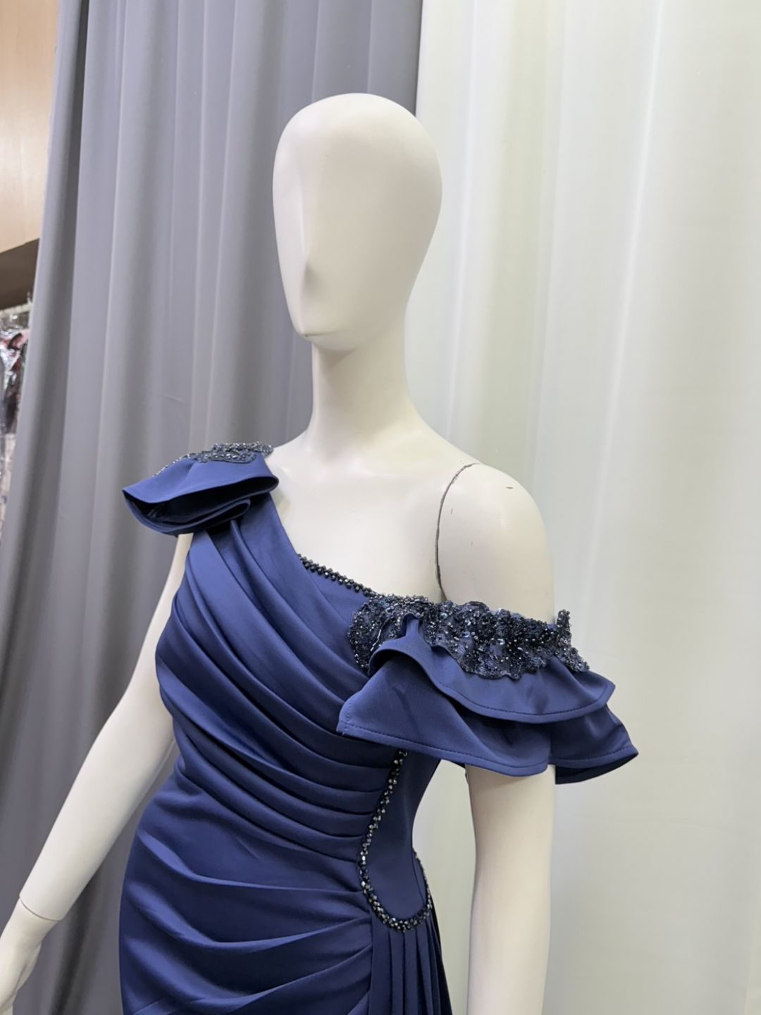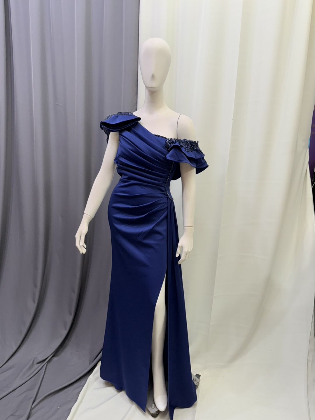 單肩荷葉立體又顯氣勢,深藍色耐看、超級高級,高衩裙擺讓身形修長、照片更有動感。#媽媽禮服 #婚宴禮服 #冰藍禮服 #晚禮服 #氣質禮服