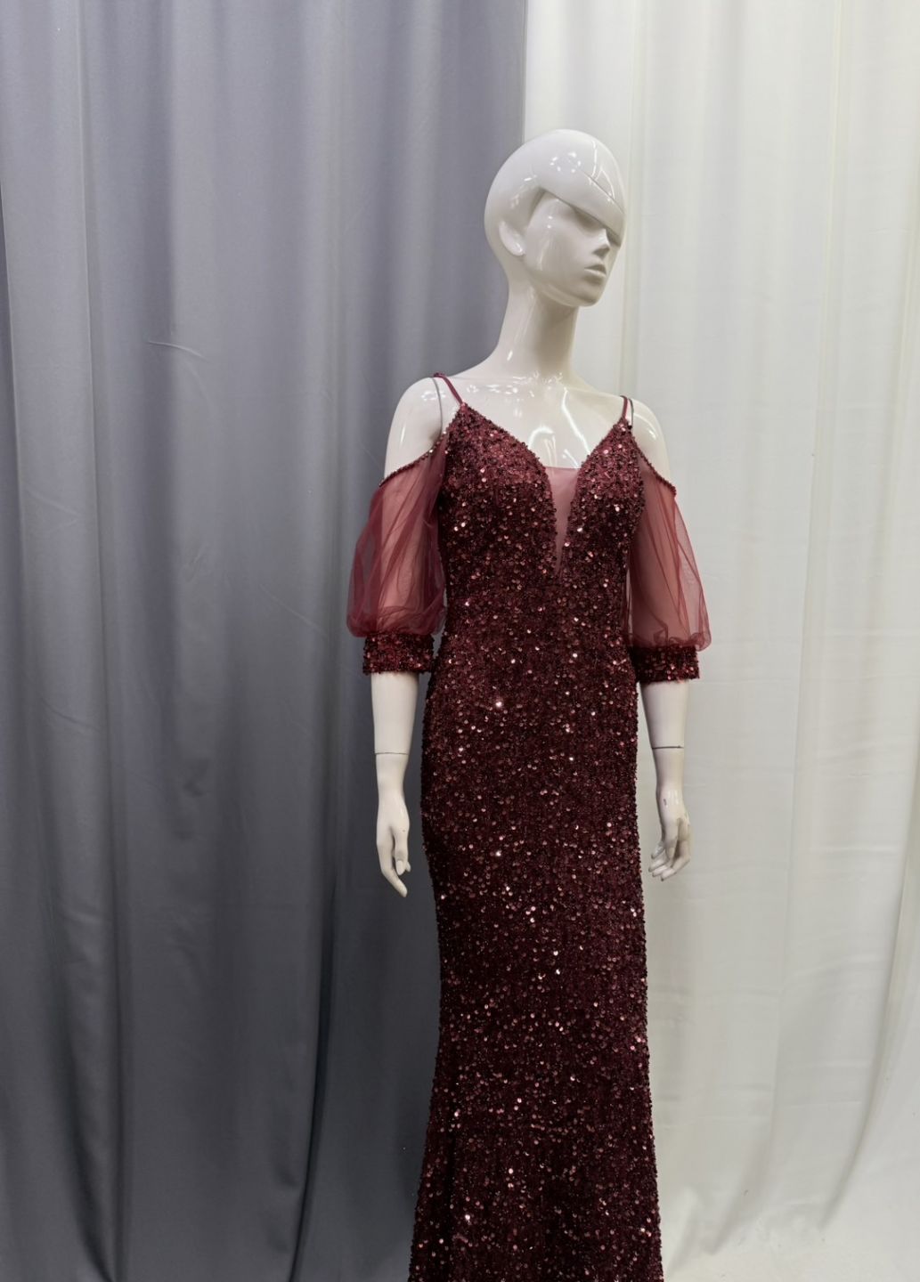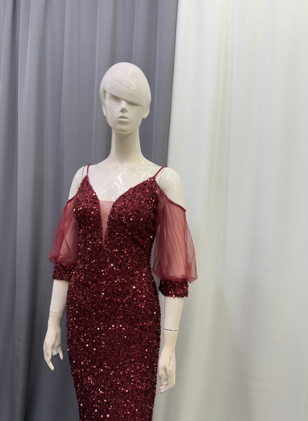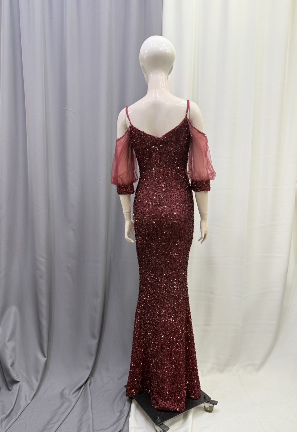 版型重點 ・魚尾版型勾勒曲線 ・紗袖修飾手臂 ・亮片在燈光下超級美