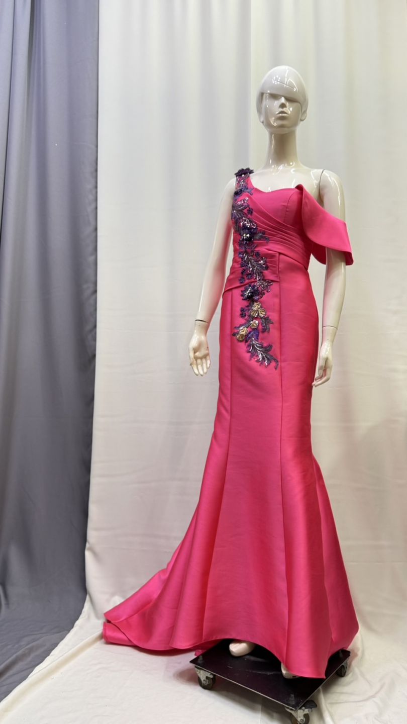 玫瑰桃紅不對稱刺繡魚尾禮服