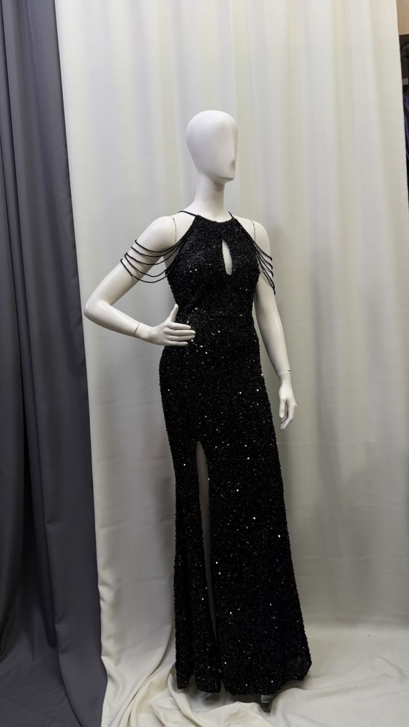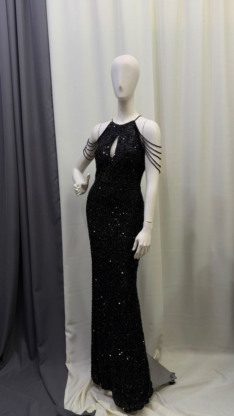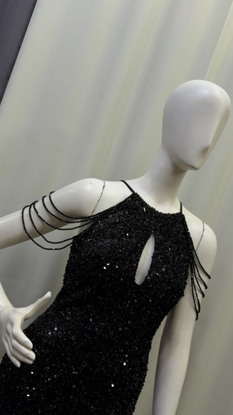 |低調女王款媽媽禮服深黑亮片在燈光下細緻閃耀,削肩設計拉長肩頸線條,流暢剪裁自然修飾身形。不張揚卻充滿氣場,是典雅又耐看的媽媽禮服首選,無論婚宴、晚宴或正式聚會,都能展現沉穩自信的魅力。