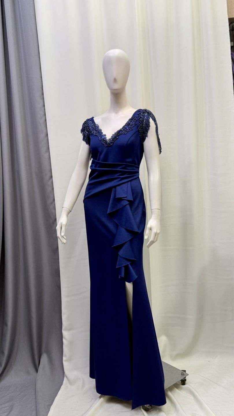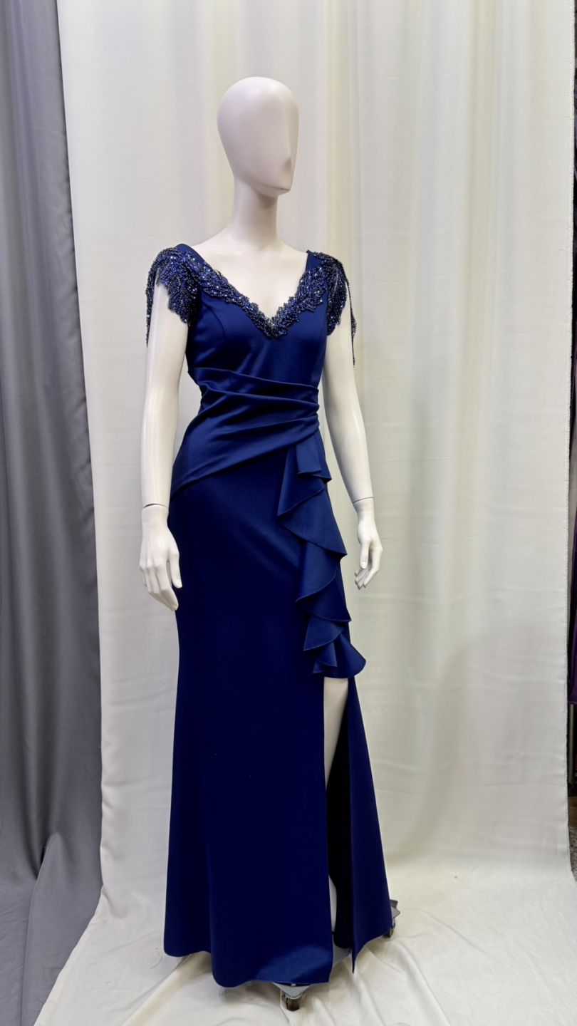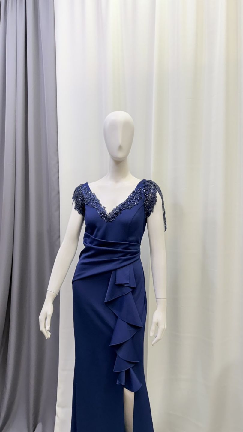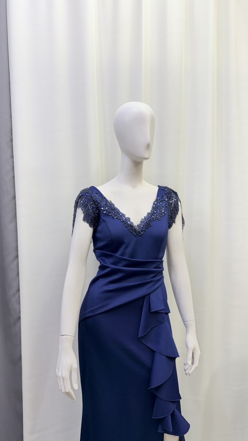 深海藍色調沉穩高貴,V 領搭配細緻刺繡,修飾胸型與上半身比例,腰線設計自然拉長身形。是一款非常適合婚禮媽媽、晚宴貴賓的禮服,溫柔中帶著高級感。