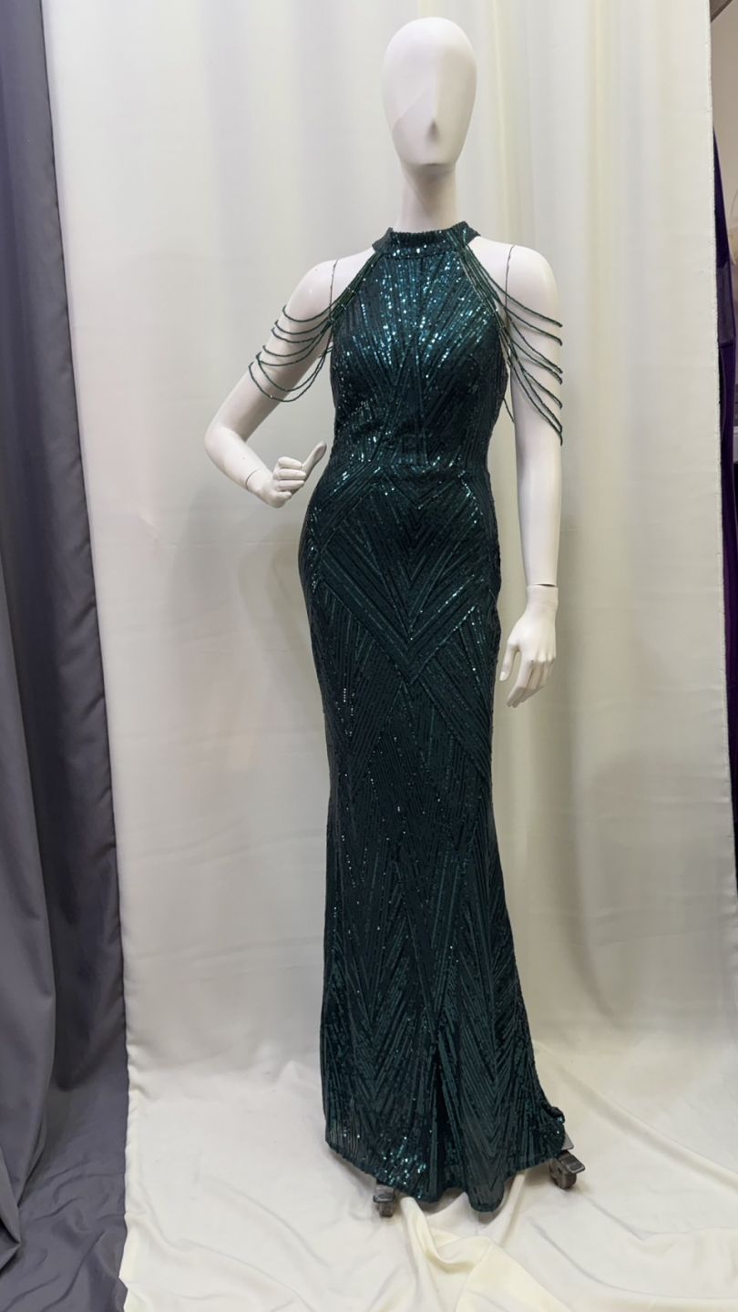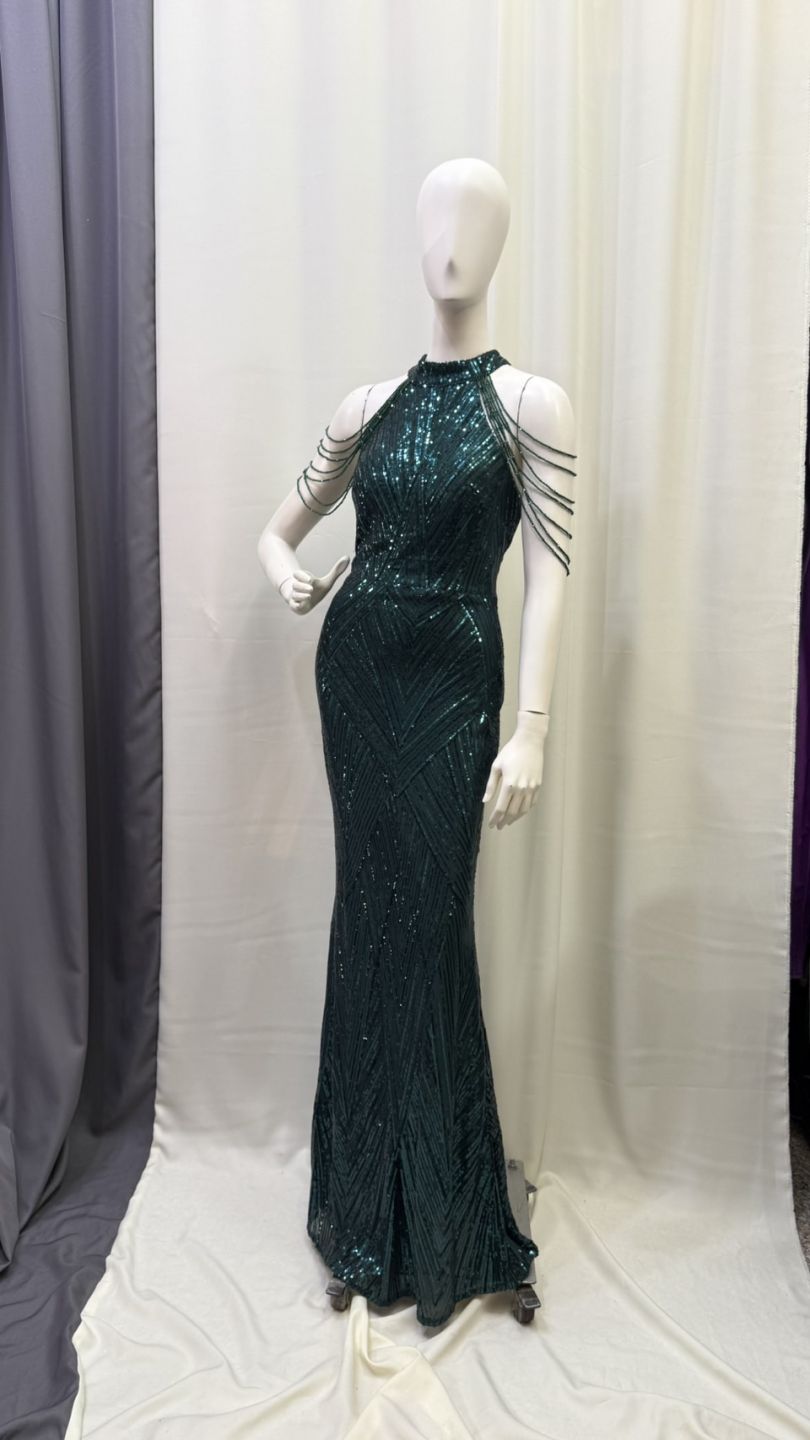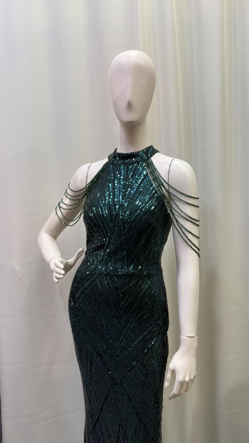 層層幾何亮片排列,像夜晚的城市燈海般閃耀。高領設計修飾肩頸線條,珠鍊垂墜袖設計增添優雅神秘氣息。深綠色調沉穩高貴,走動時光澤流動,氣場全開。
